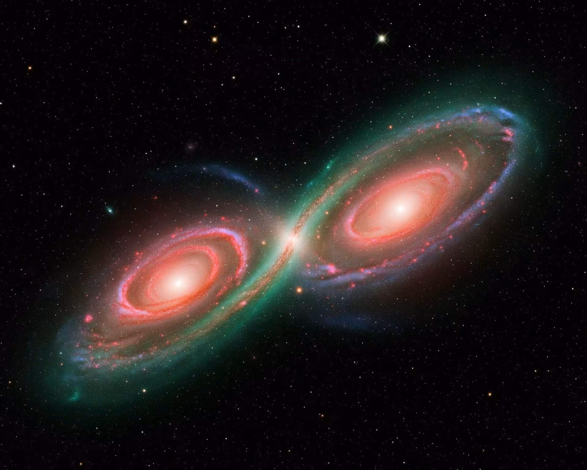 综合这些多波段数据,一个详细的“无限”星系物理模型浮出水面。该系统是两个大质量盘状星系之间一次罕见的、高速且近乎正面的碰撞的结果。这两个星系核是原始星系的致密中央核球,质量异常巨大,其恒星质量分别估计约为800亿和1800亿倍太阳质量。它们在天球上的投影距离约为10千秒差距(kpc)。